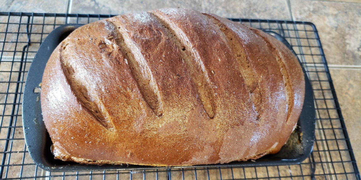 9. Bake 30-40 minutes or until it sounds hollow when tapped, if top crust is over-browning, tent with foil (internal temp should be 200-210 degrees)